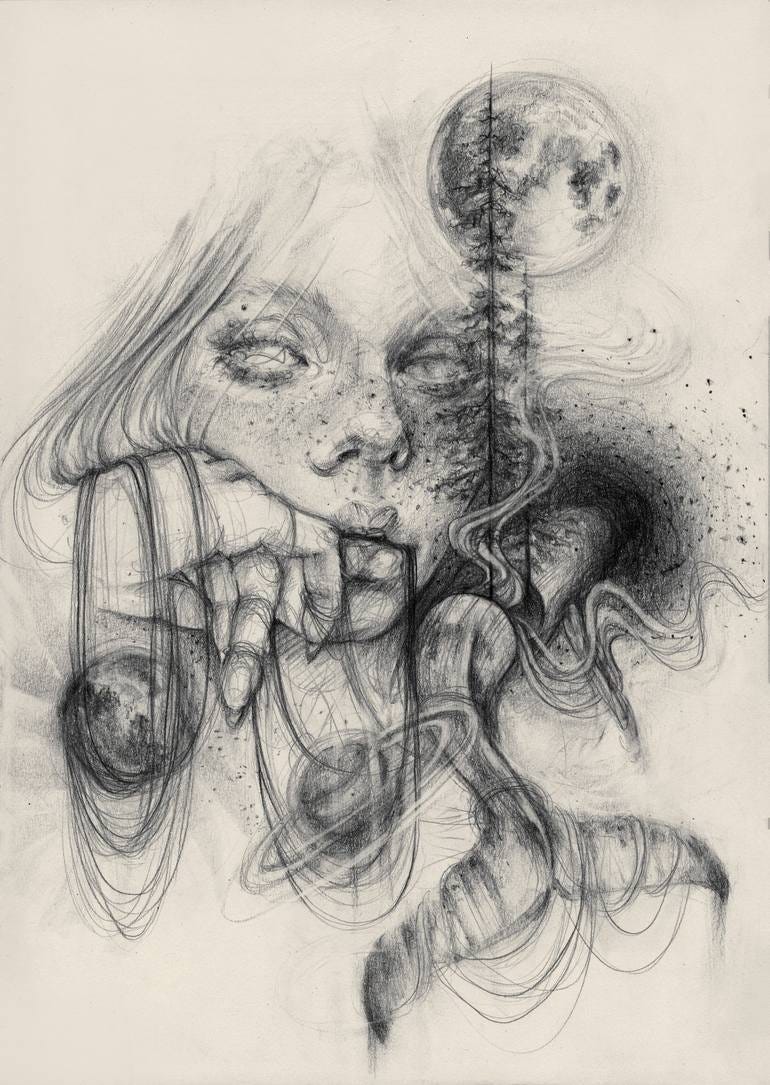 The Last Dreamer Pixie Bruner When she finally realized she was the only one remaining she hid away. Ferreted away books with art and lots of paint, clay, yarn, fabric, paper, ribbons, inks, filled a cabin she fled to with art supplies and writing instruments. She hoarded history of the things volume by volume, gathered from shelves from empty homes in neglected cul de sacs and studied them. Then she began to use her curse- she first made companions-soft pets, then progressed to imaginary recipes for a candlelit ballroom (that maybe was a 3-legged card table and a camping lantern.) that provided her balanced nutrition. Occasionally refugees stumbled by the house, ignoring the papers and scratches on them from the before times. It was merely debris and trash. A madwoman in a fire hazard (but a good meal and oddly generous hospitality). By the time she became strong enough to breathe life into the aether itself transform thought into existence, transmute imagination into reality, and make entire worlds, there was no one else left to go to them. Facts and figures, code and circuit boards became art installations in the ruins of the dead forest she dwelt in. She wasn’t escaping- she was never running away. the last dreamer— running towards a space to dream. When they came to harvest her- drag her back to the cubicle housing and shift work in factories Her lions and tigers tore and roared at the machines. Heavens to Grok, GPT-Nine, our Lord and Savior, Murgatroyd! A unicorn with distemper gored the machine squad leader! It was a quick simple surgery. Primitive- not done in many generations, now perfected and automated, as everything should be. They simply put her to sleep. Now she always sleeps dreamlessly, Her eyes now see only the backside of her eyelids. She’s cured! And no more anomalies. Everyone is safe again, No more dreamers of any sort! She sees only what is there before her. Not what is possible. Order restored. She’s sane, aphantastic, no longer delusional, and everyone is happy because they are told they are happy (Ferocious wild creatures she released still terrorize the countryside!)